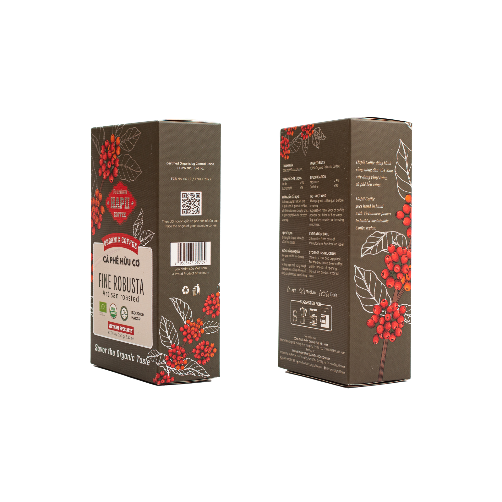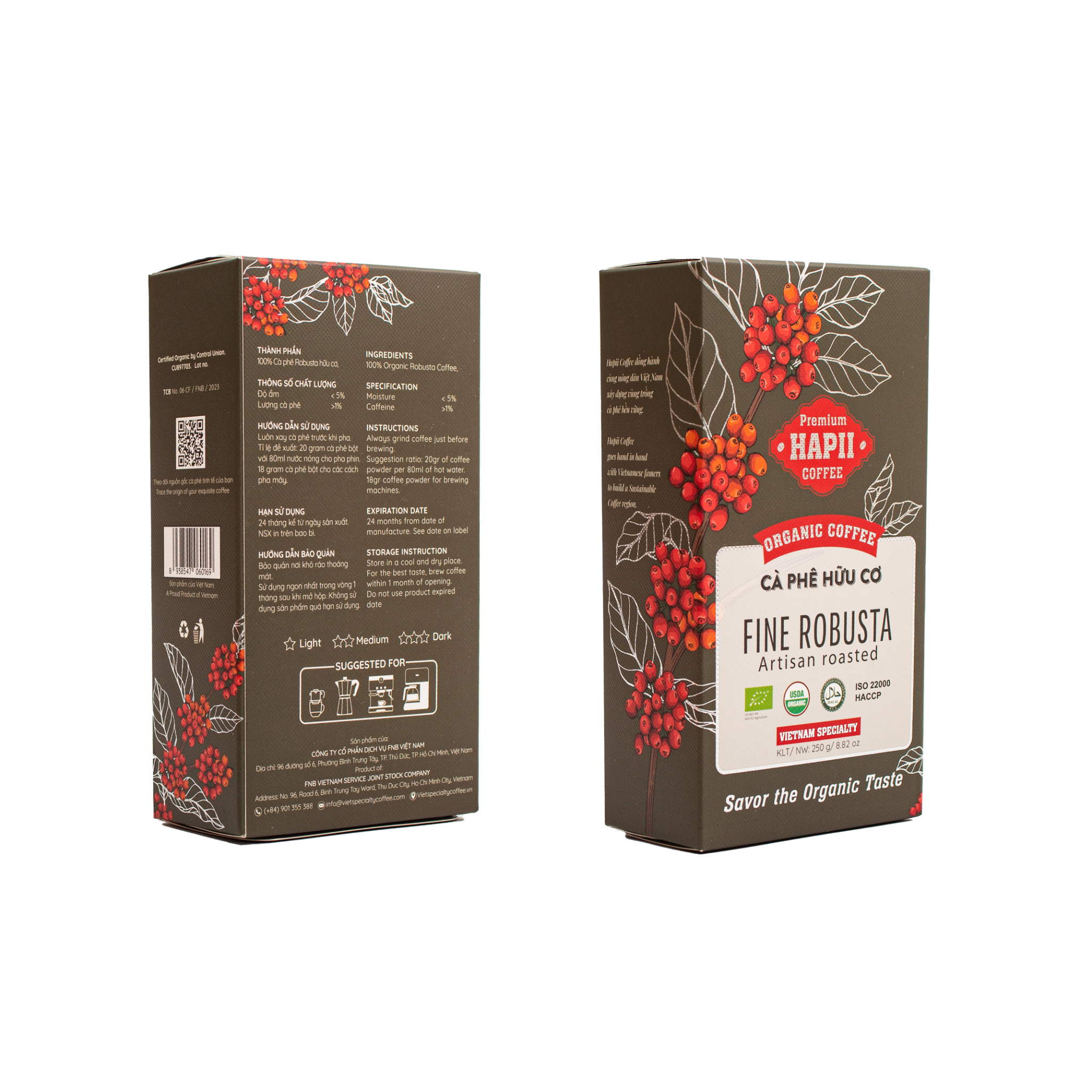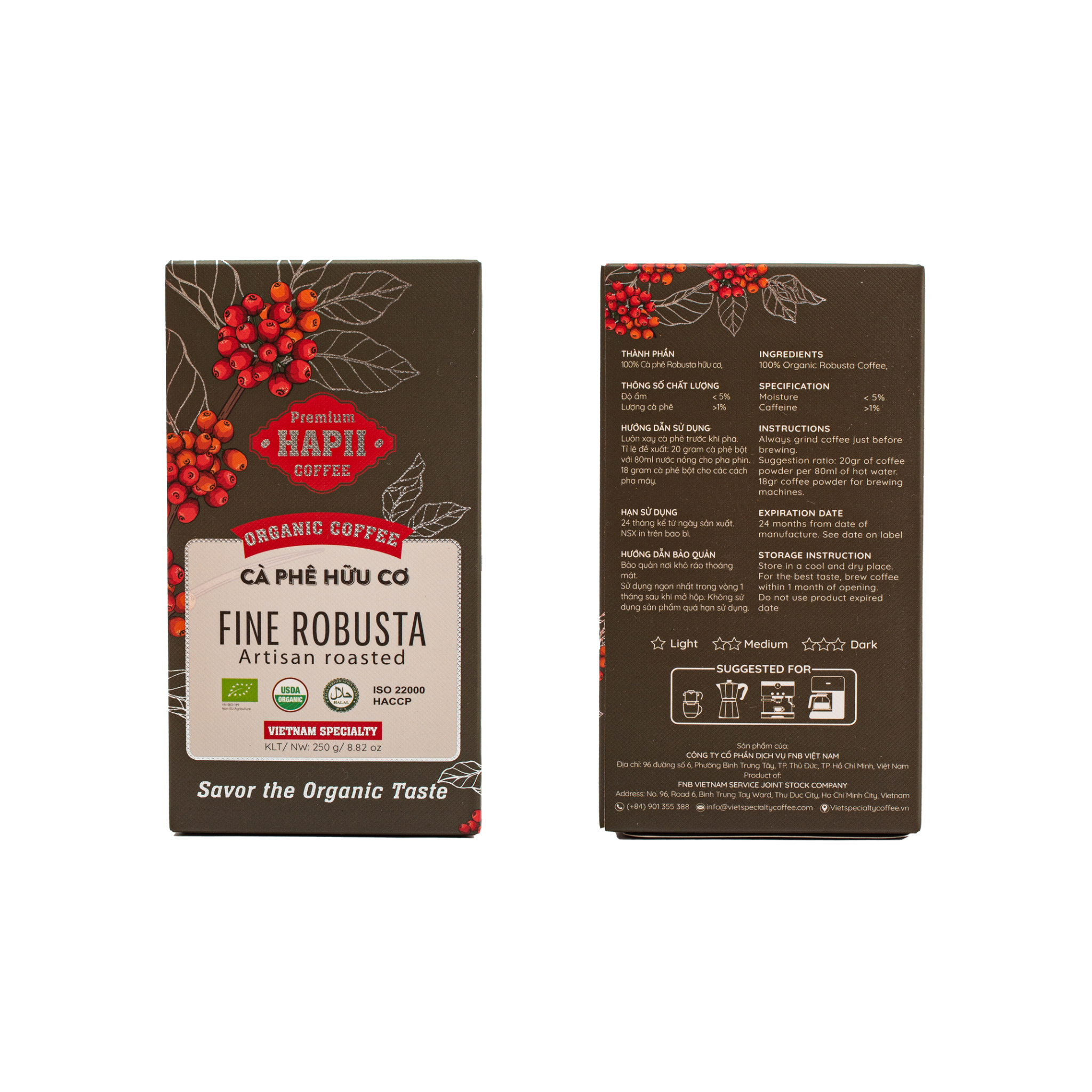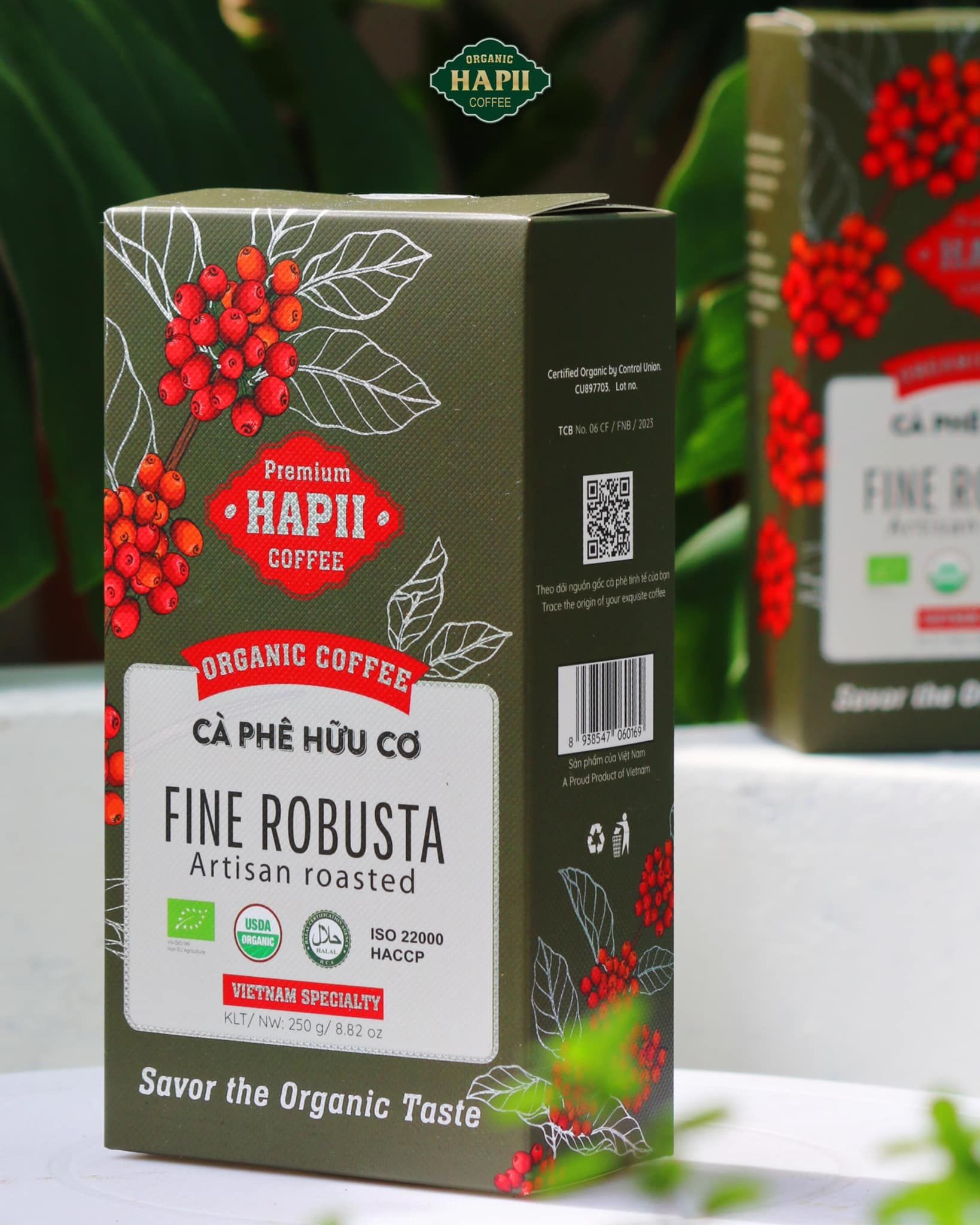 Tên sản phẩm: Cà Phê Hữu Cơ Fine Robusta Hapii Coffee Hộp 250G Xuất xứ: Việt Nam Quy cách đóng gói: Hộp 250G Hạn sử dụng: 24 tháng Thành phần: 100% cà phê Robusta Organic Hướng dẫn bảo quản: bảo quản nơi khô ráo, thoáng mát, tránh ánh nắng trực tiếp mặt trời. Luôn đóng kín bao bì sau khi sử dụng. Sản phẩm được chịu trách nhiệm trực tiếp bởi: - Công Ty: Công Ty Cổ Phần Dịch Vụ FNB Việt Nam - Địa chỉ: 96 Đường Số 6, Phường Bình Trưng Tây, TP. Thủ Đức, TP. Hồ Chí Minh